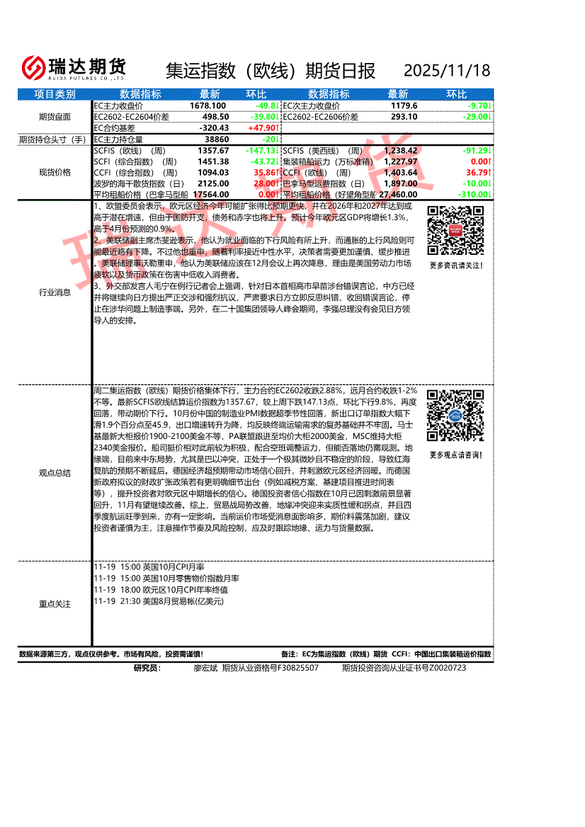 瑞达期货-集运指数(欧线)期货日报-251118