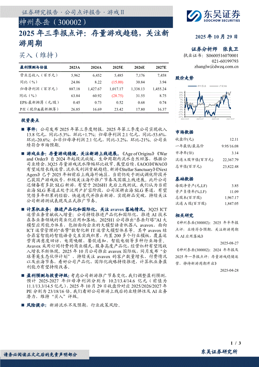 神州泰岳:东吴证券-神州泰岳-300002-2025年三季报点评:存量游戏趋稳,关注新游周期-251029
