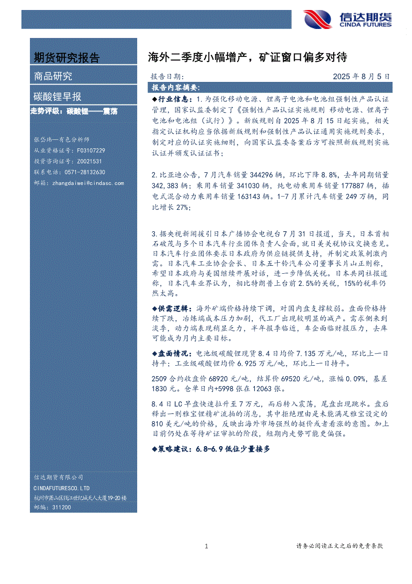 信达期货-碳酸锂早报:海外二季度小幅增产,矿证窗口偏多对待-250805