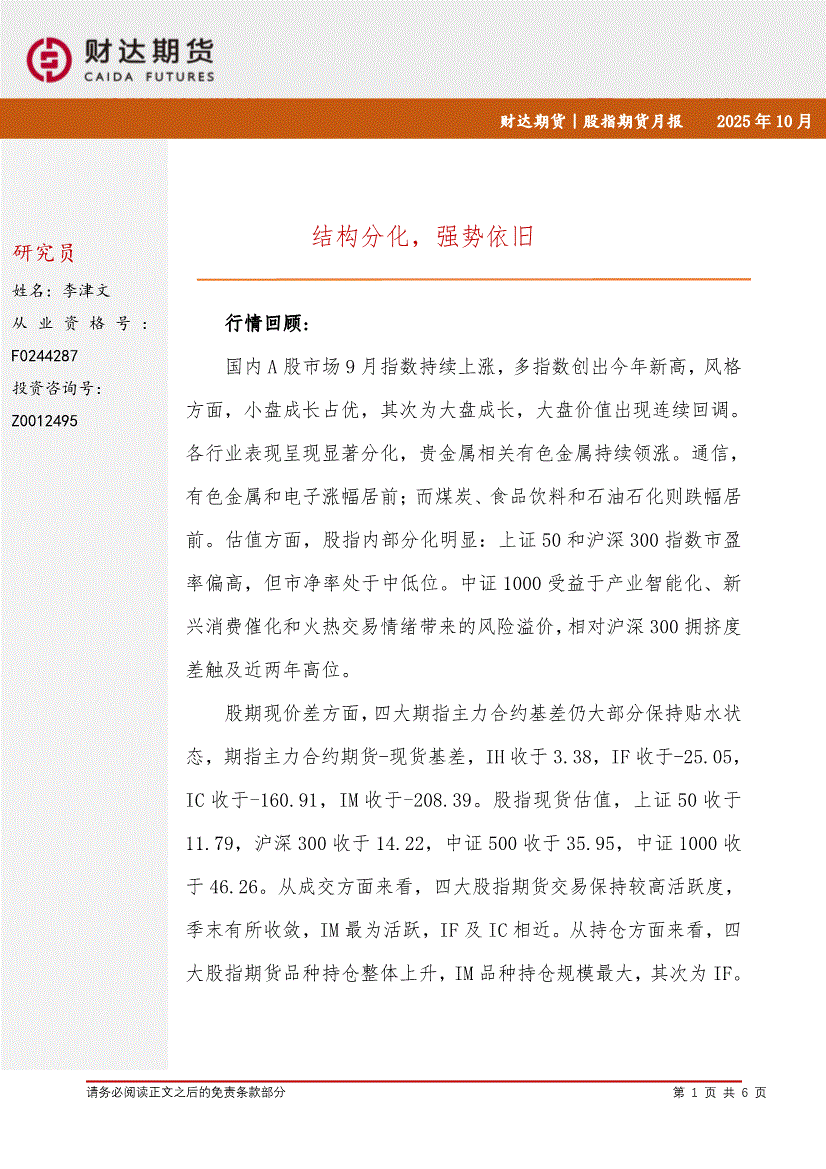 财达期货-股指期货月报:结构分化,强势依旧-251010
