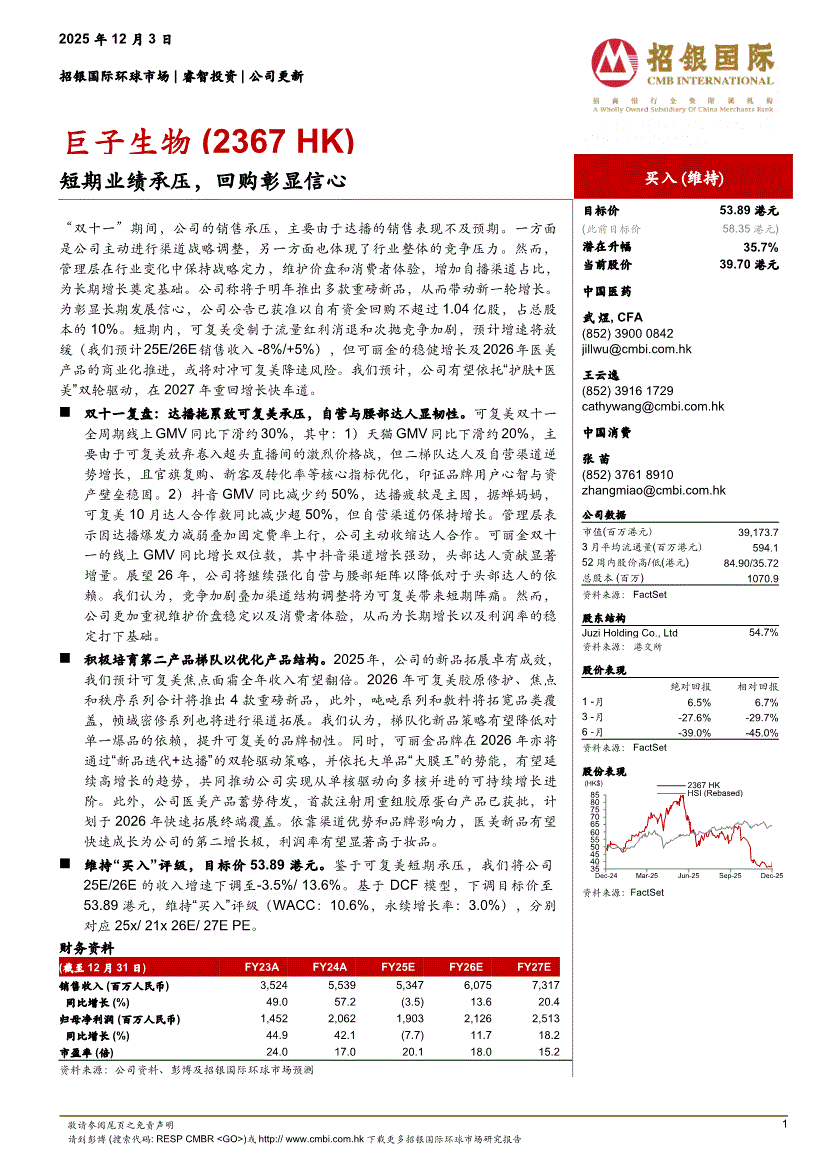 巨子生物:招银国际-巨子生物-2367.HK-短期业绩承压,回购彰显信心-251203