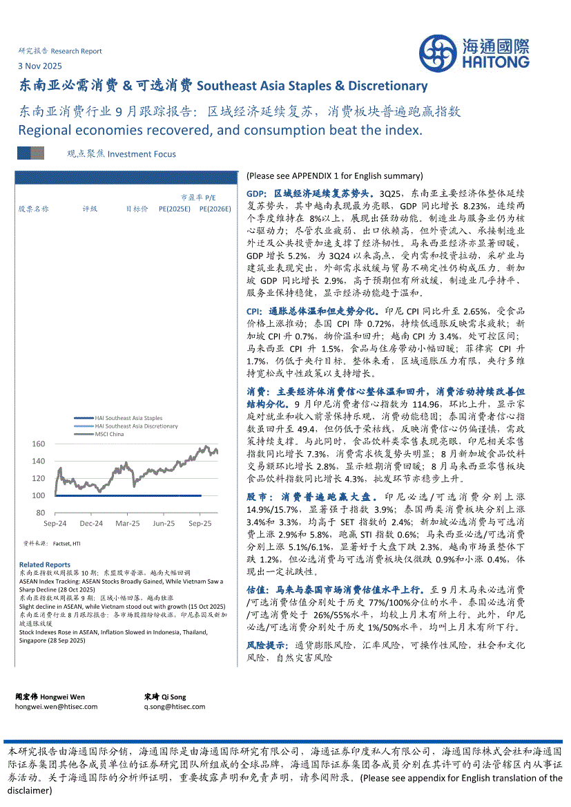 消费行业:海通国际-东南亚必需消费&可选消费:东南亚消费行业9月跟踪报告,区域经济延续复苏,消费板块普遍跑赢指数-251103