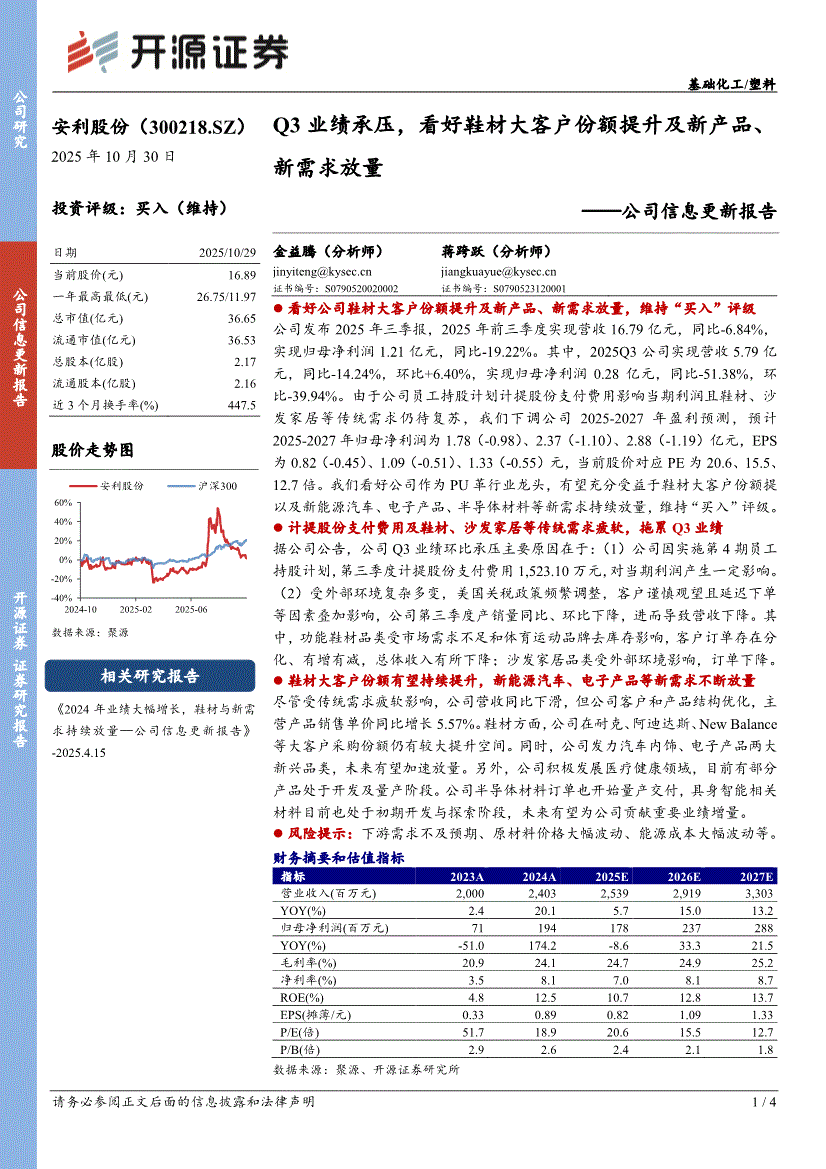 安利股份:开源证券-安利股份-300218-公司信息更新报告:Q3业绩承压,看好鞋材大客户份额提升及新产品、新需求放量-251030