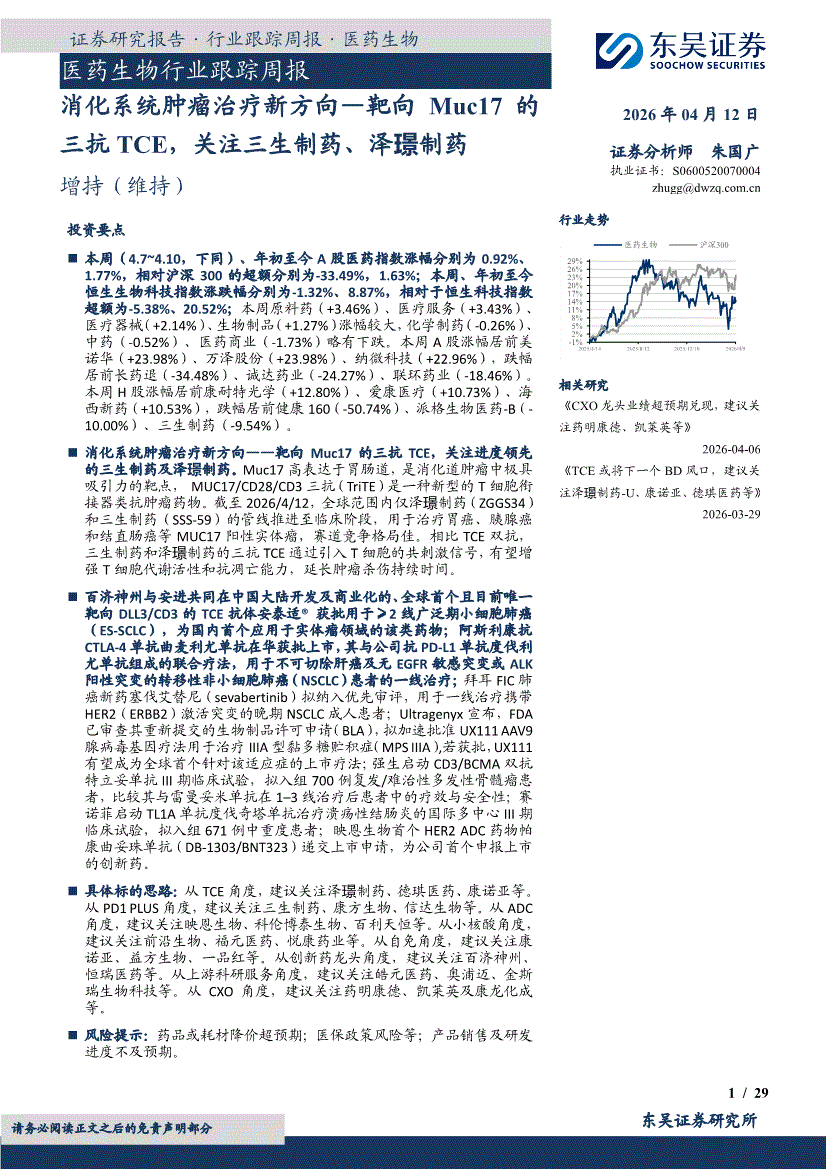 医药生物行业:东吴证券-医药生物行业跟踪周报:消化系统肿瘤治疗新方向—靶向Muc17的三抗TCE,关注三生制药、泽璟制药-260412