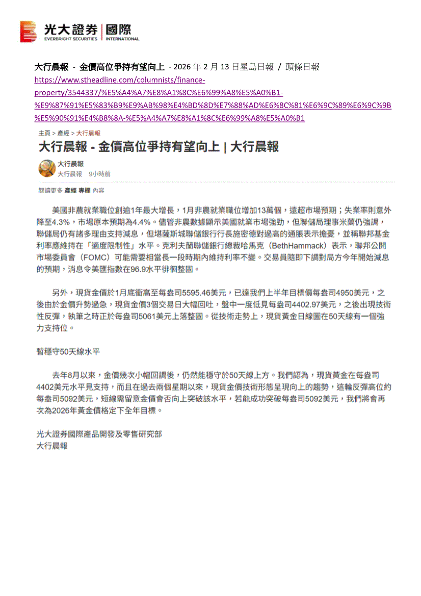 光大证券(国际)-大行晨报:金价高位争持有望向上-260213