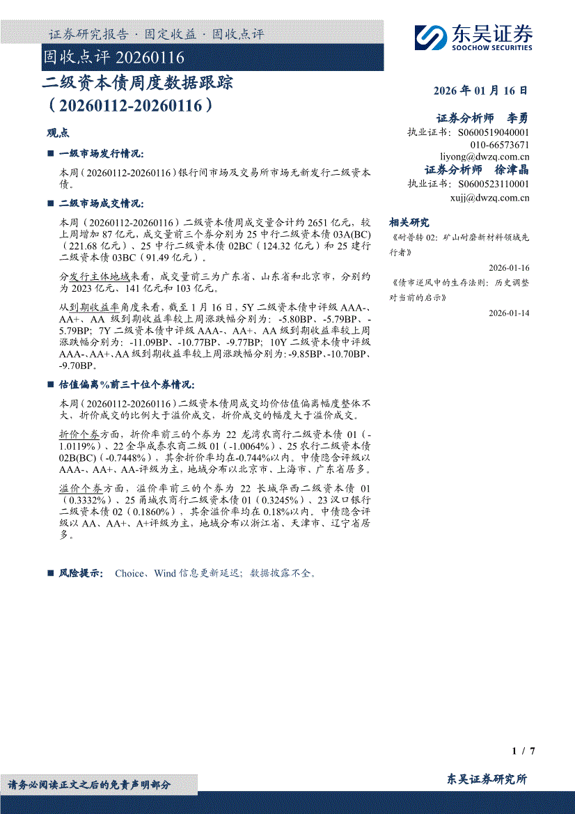 东吴证券-固收点评:二级资本债周度数据跟踪(20260112~20260116)-260116
