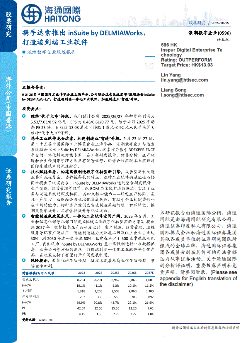 浪潮数字企业:海通国际-浪潮数字企业-0596.HK-跟踪报告:携手达索推出inSuite by DELMIAWorks,打造端到端工业软件-251015