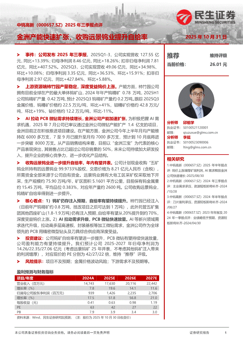 中钨高新:民生证券-中钨高新-000657-2025年三季报点评:金洲产能快速扩张,收购远景钨业提升自给率-251031