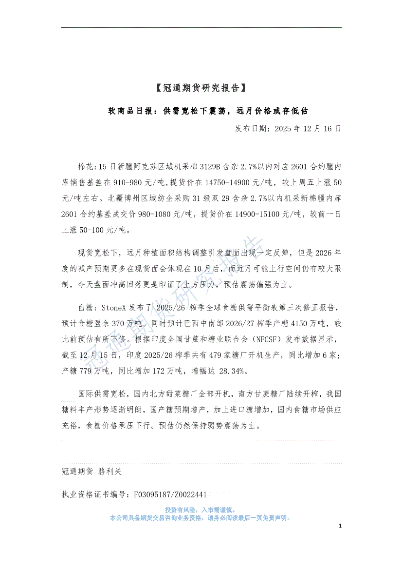 冠通期货-软商品日报:供需宽松下震荡,远月价格或存低估-251216