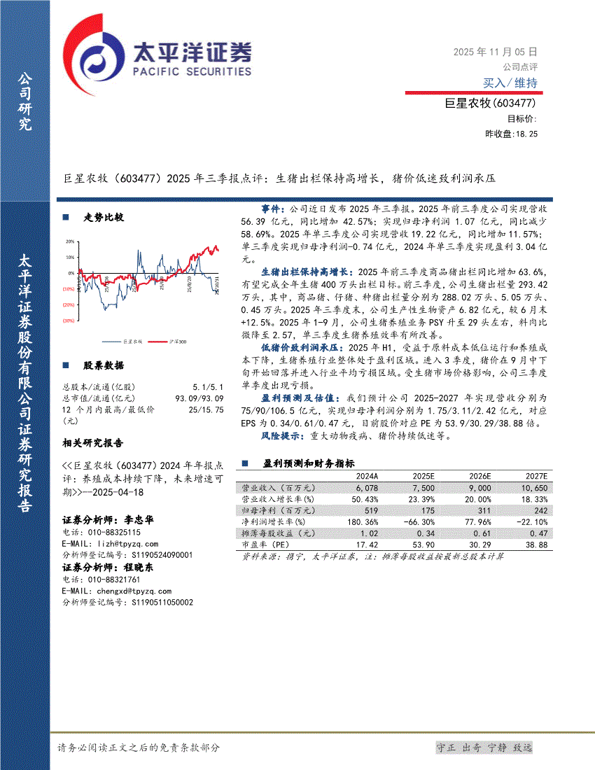 巨星农牧:太平洋证券-巨星农牧-603477-2025年三季报点评:生猪出栏保持高增长,猪价低迷致利润承压-251105