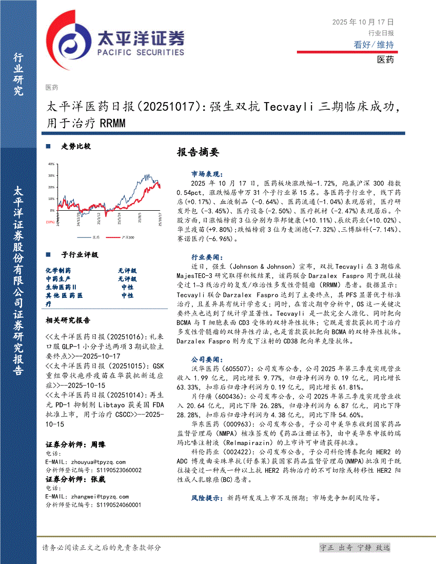 医药行业:太平洋证券-医药行业日报:强生双抗Tecvayli三期临床成功,用于治疗RRMM-251017