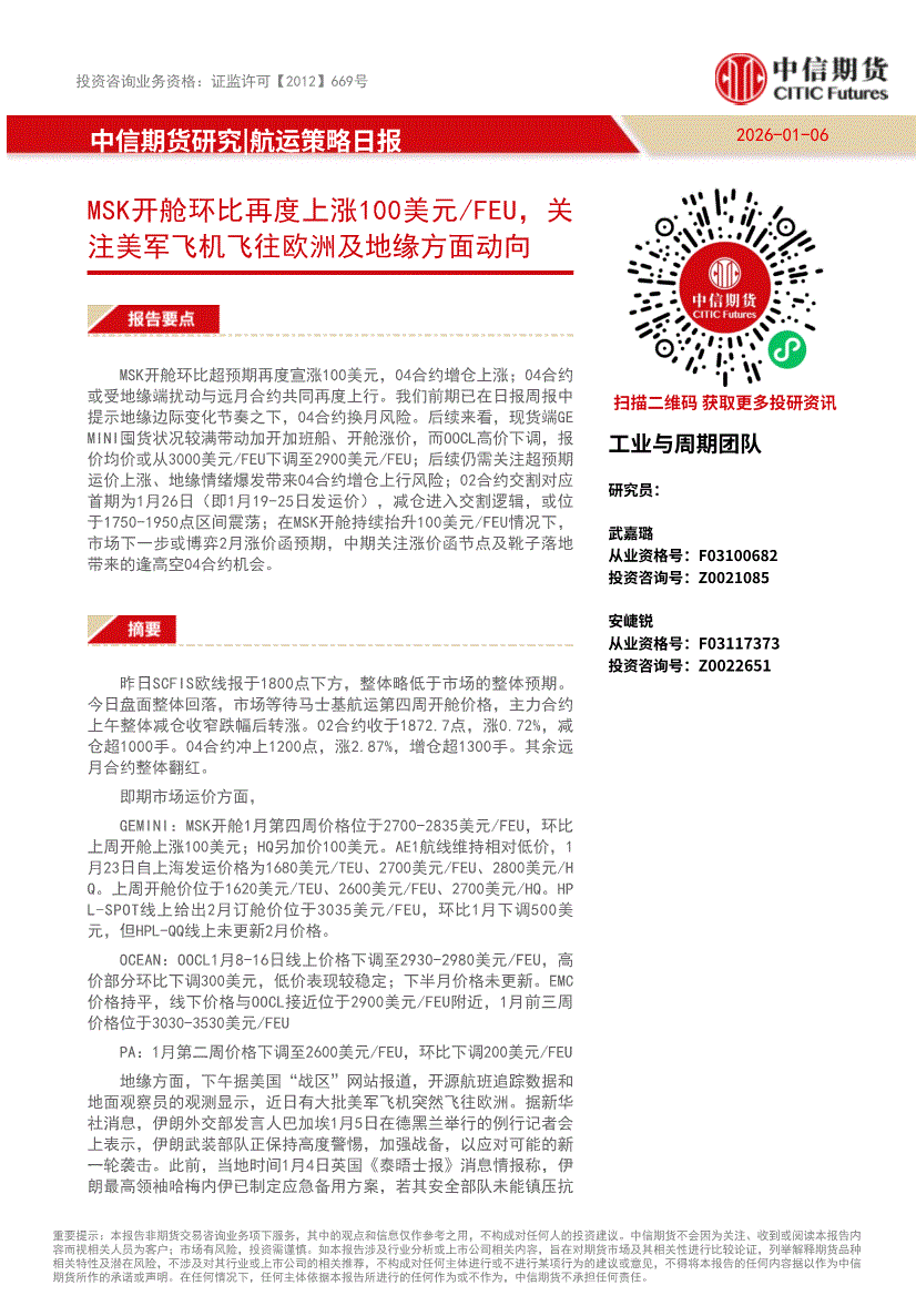 中信期货-航运策略日报:MSK开舱环比再度上涨100美元FEU,关注美军飞机飞往欧洲及地缘方面动向-260106