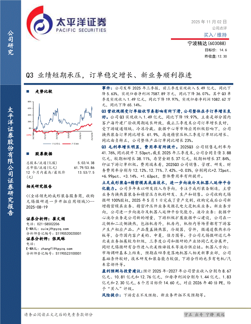 宁波精达:太平洋证券-宁波精达-603088-Q3业绩短期承压,订单稳定增长、新业务顺利推进-251102