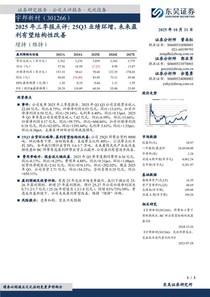 宇邦新材:东吴证券-宇邦新材-301266-2025年三季报点评:25Q3业绩环增,未来盈利有望结构性改善-251031