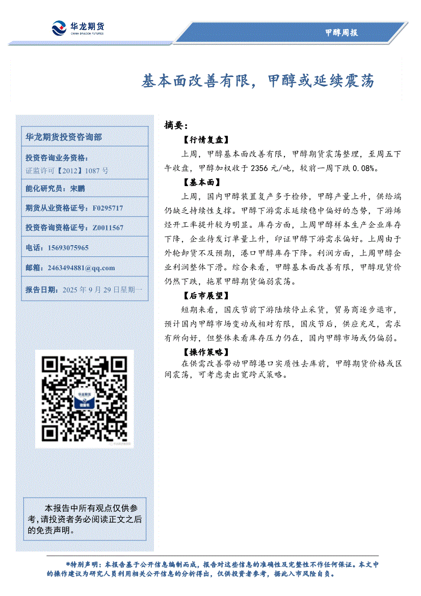 华龙期货-甲醇周报:基本面改善有限,甲醇或延续震荡-250929