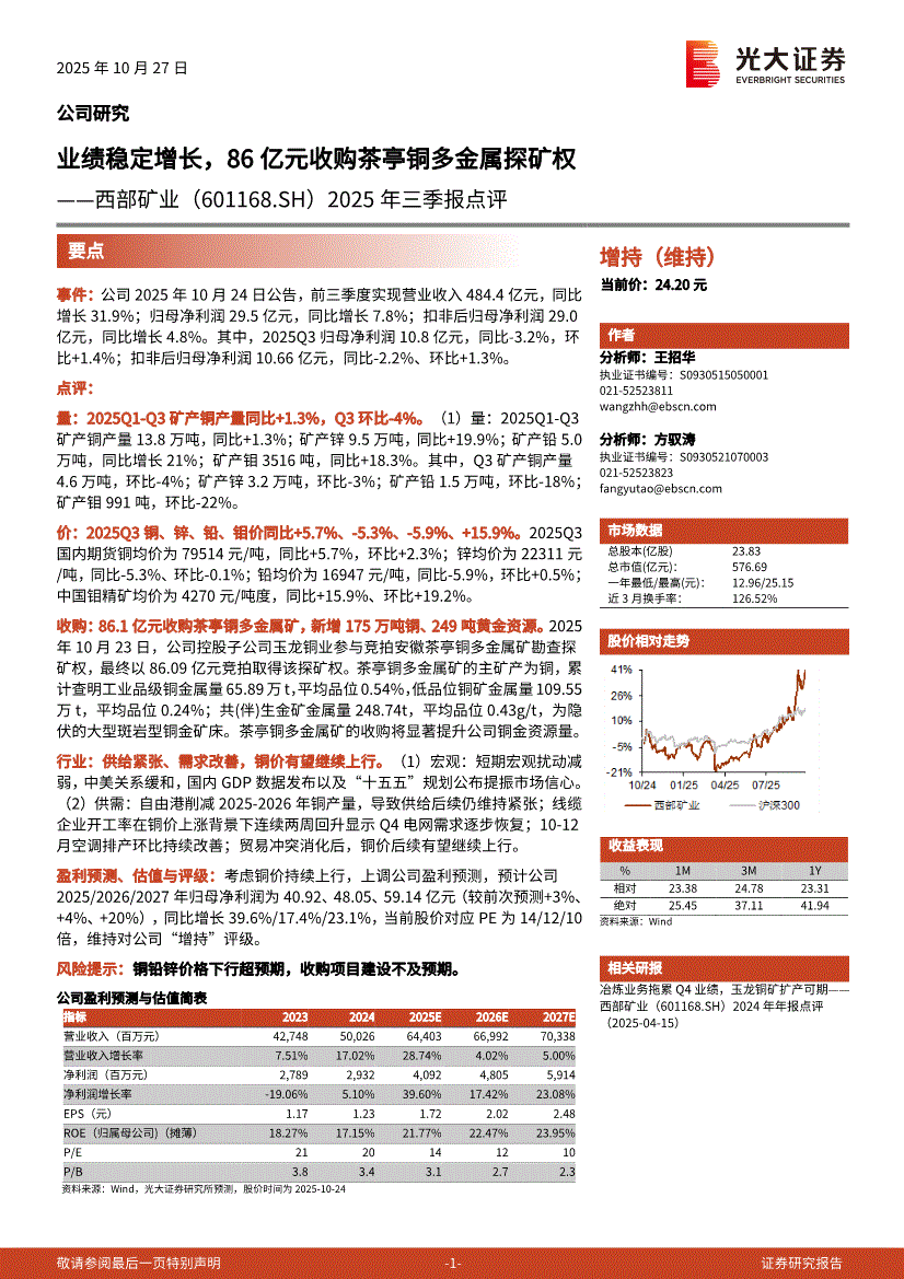 西部矿业:光大证券-西部矿业-601168-2025年三季报点评:业绩稳定增长,86亿元收购茶亭铜多金属探矿权-251027