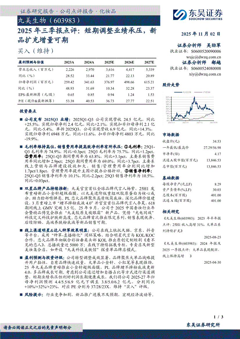 丸美生物:东吴证券-丸美生物-603983-2025年三季报点评:短期调整业绩承压,新品扩充增量可期-251102