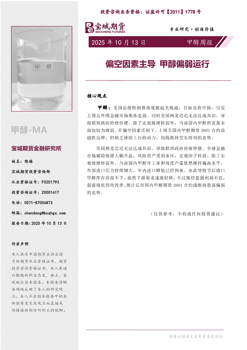 宝城期货-甲醇周报:偏空因素主导,甲醇偏弱运行-251013