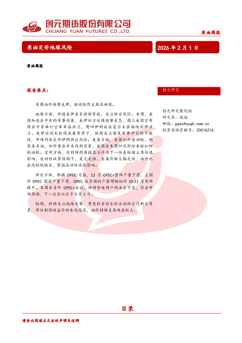 创元期货-原油周报:原油定价地缘风险-260201