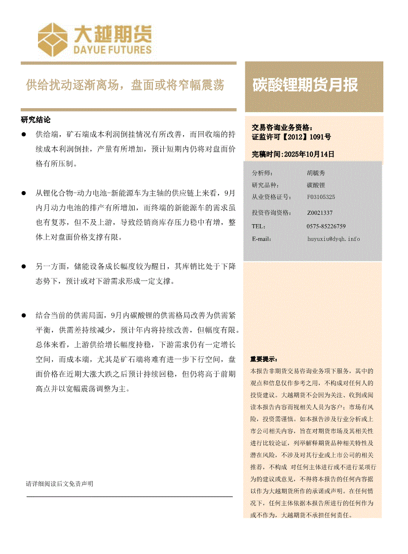 大越期货-碳酸锂期货月报:供给扰动逐渐离场,盘面或将窄幅震荡-251014