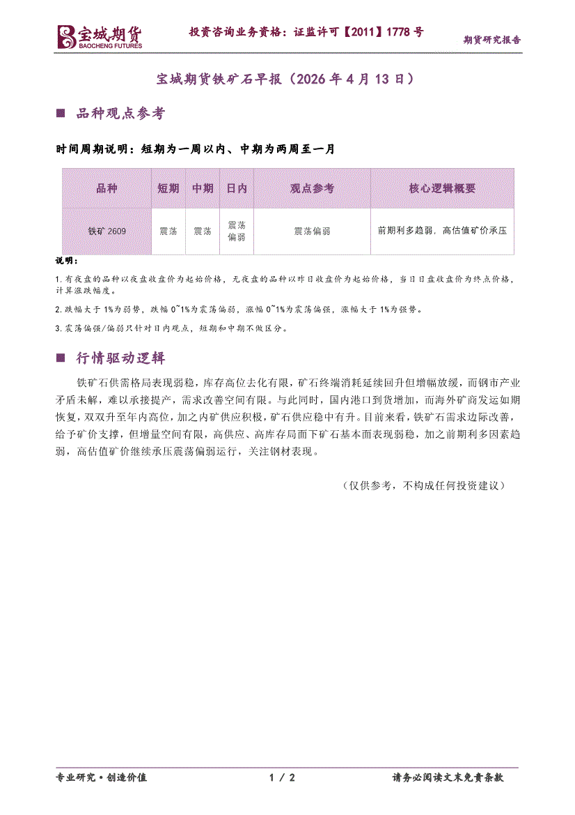 宝城期货-铁矿石早报-260413