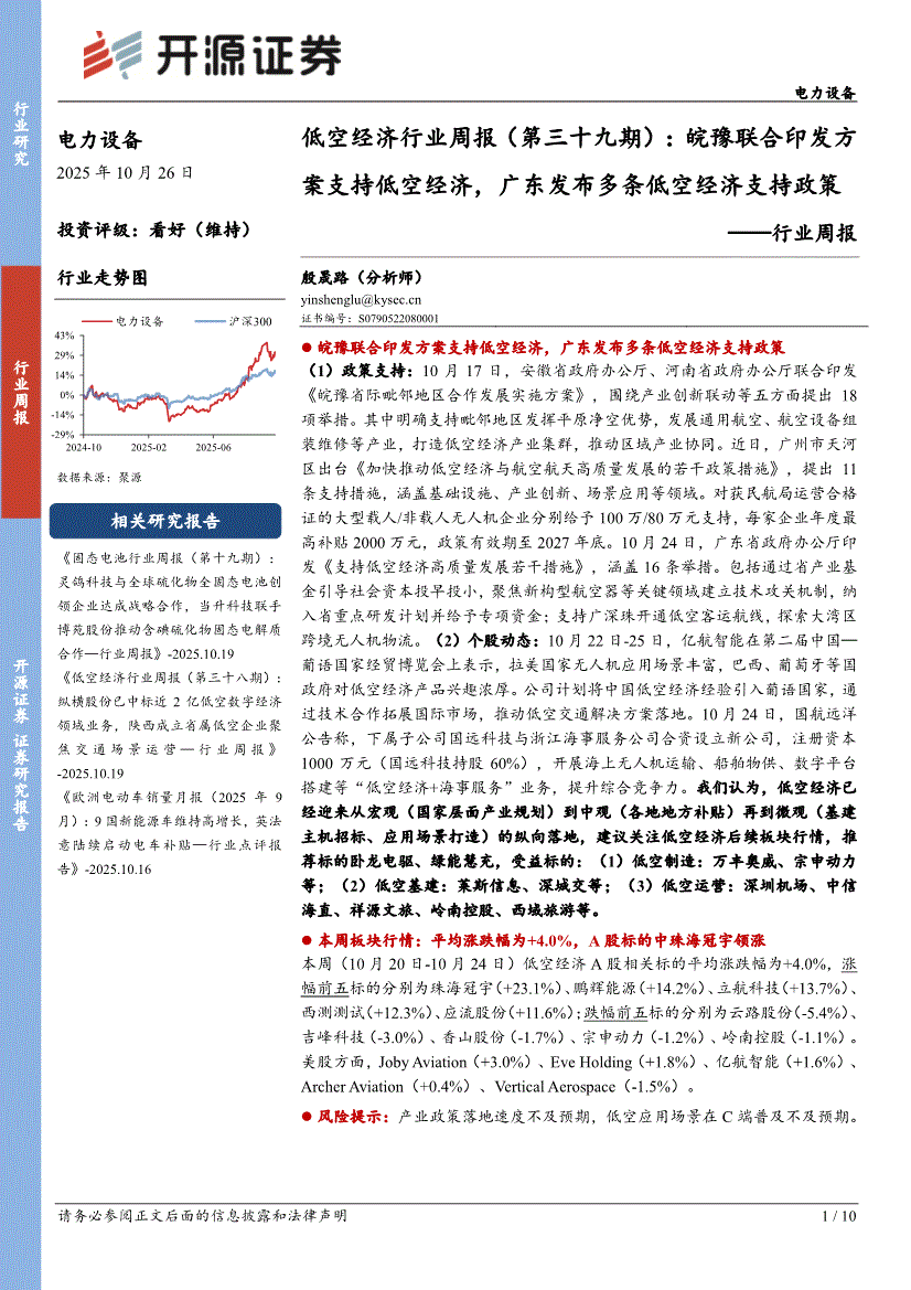 电力设备行业:开源证券-低空经济行业周报(第三十九期):皖豫联合印发方案支持低空经济,广东发布多条低空经济支持政策-251026
