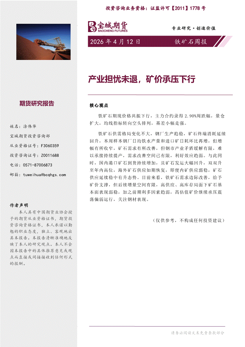 宝城期货-铁矿石周报:产业担忧未退,矿价承压下行-260412