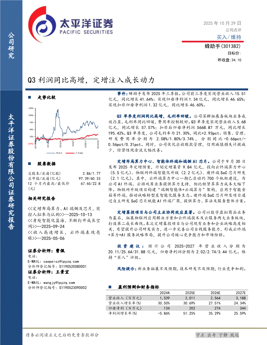 蜂助手:太平洋证券-蜂助手-301382-Q3利润同比高增,定增注入成长动力-251029