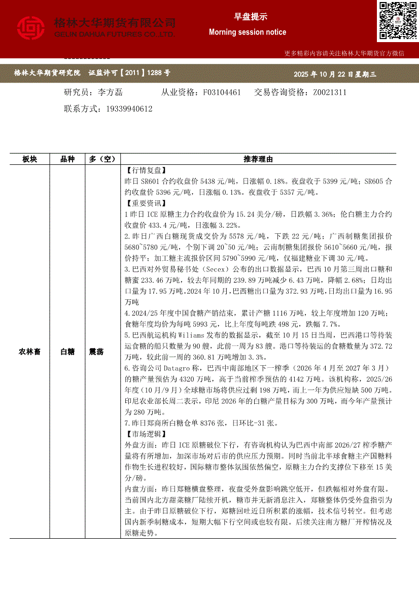 格林大华期货-早盘提示:白糖红枣橡胶-251022