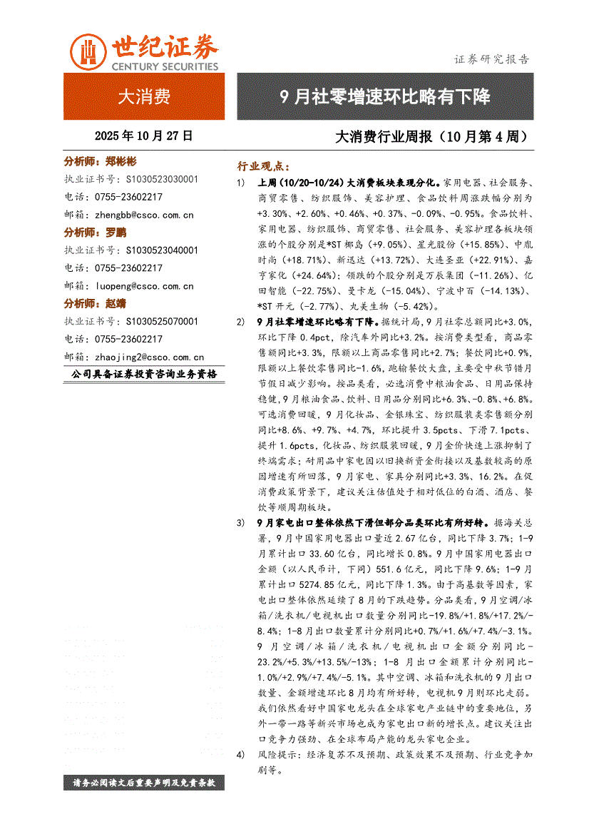 大消费行业:世纪证券-大消费行业周报(10月第4周):9月社零增速环比略有下降-251027