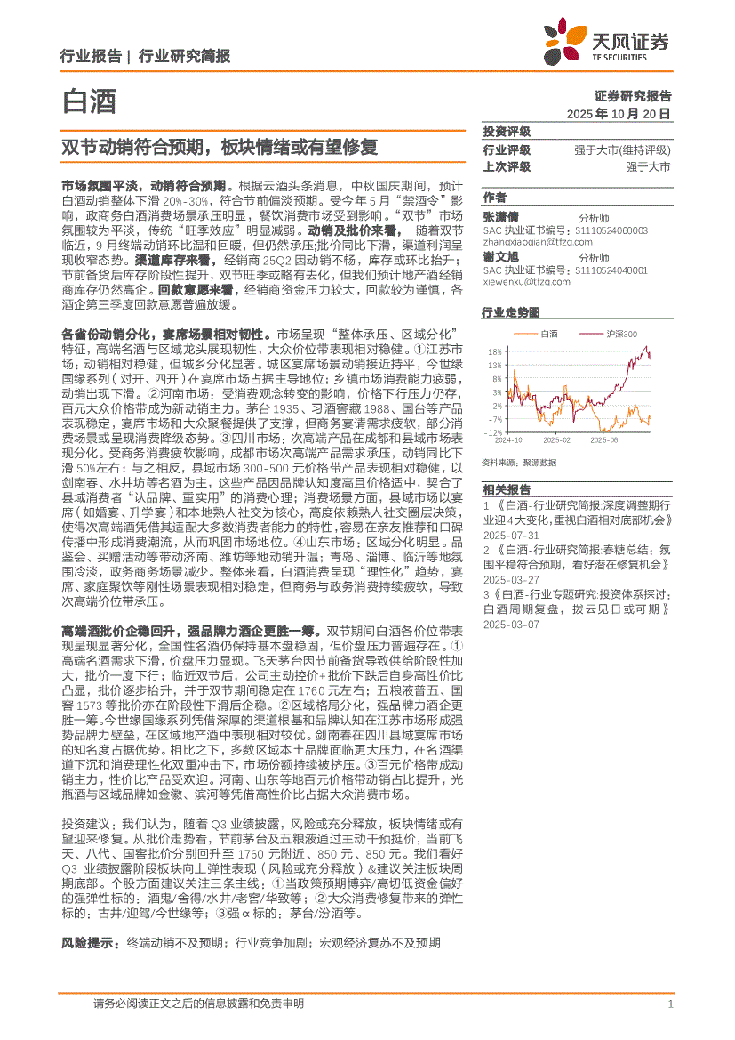 白酒行业:天风证券-白酒行业:双节动销符合预期,板块情绪或有望修复-251020