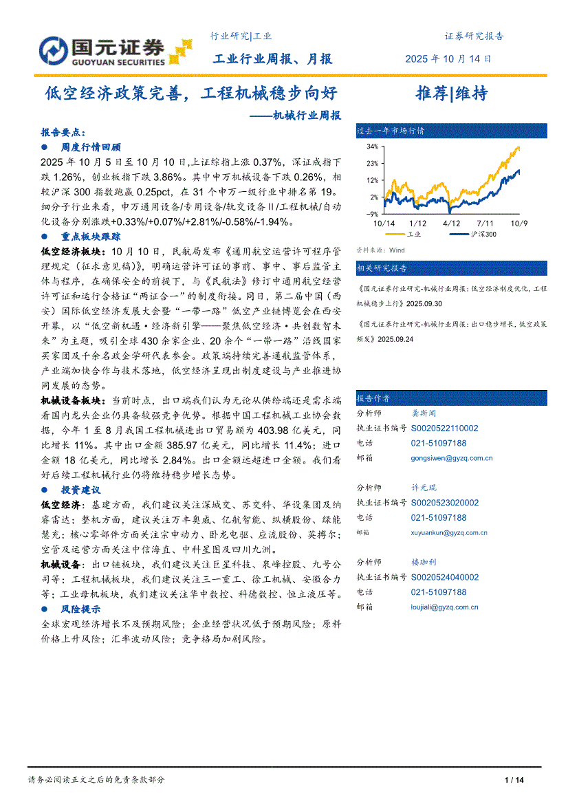 机械行业:国元证券-机械行业周报:低空经济政策完善,工程机械稳步向好-251014