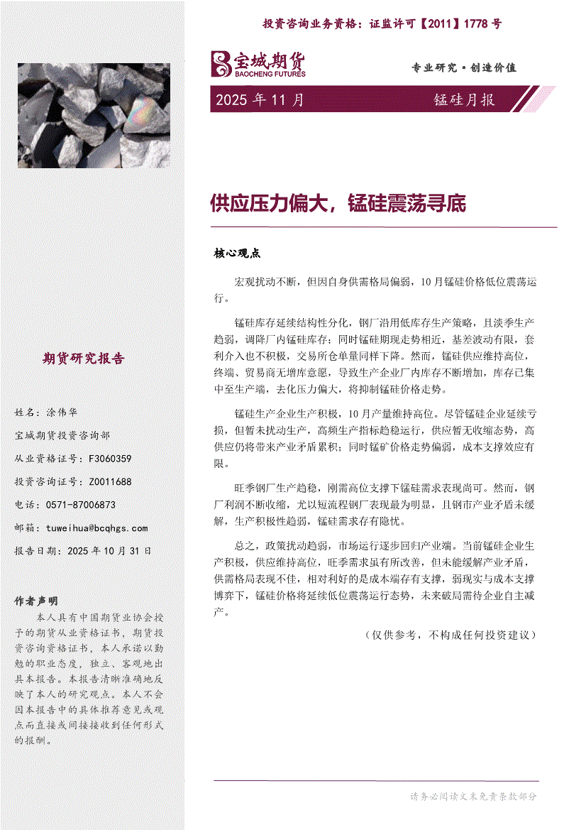 宝城期货-锰硅月报:供应压力偏大,锰硅震荡寻底.pdf-251031