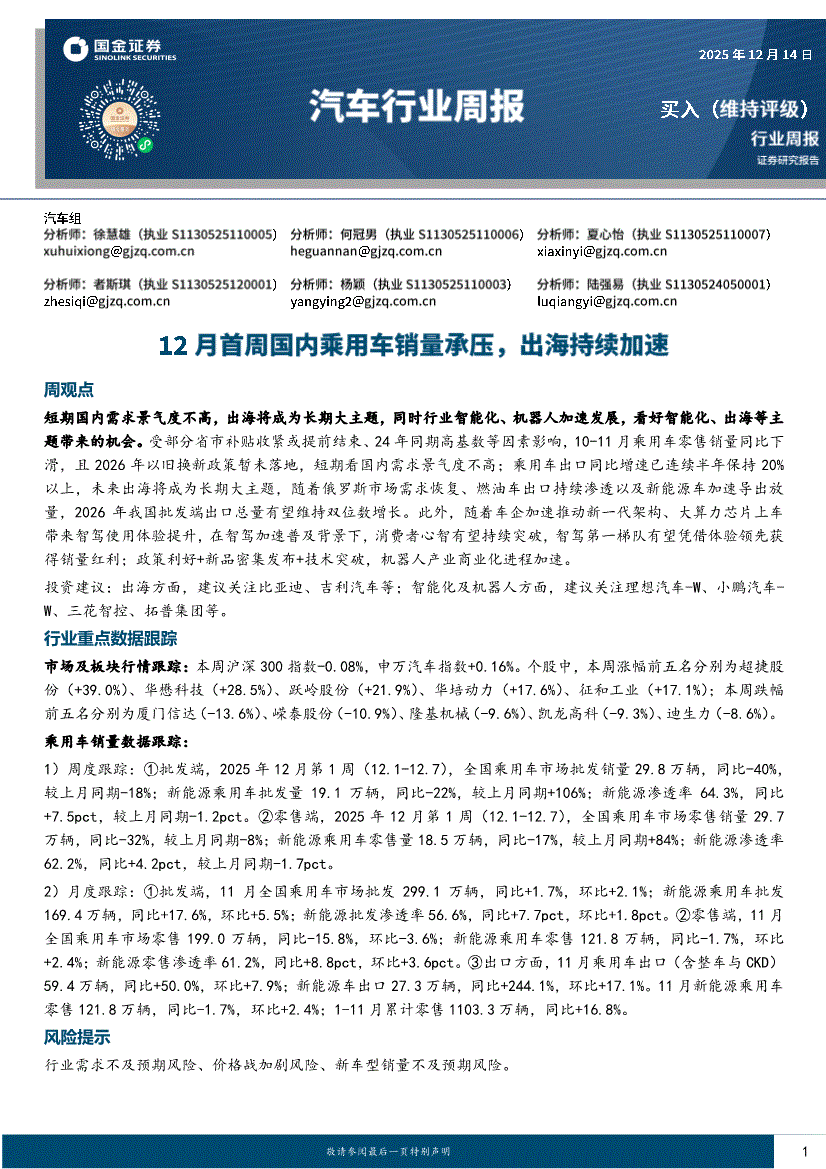 汽车行业:国金证券-汽车行业周报:12月首周国内乘用车销量承压,出海持续加速-251214