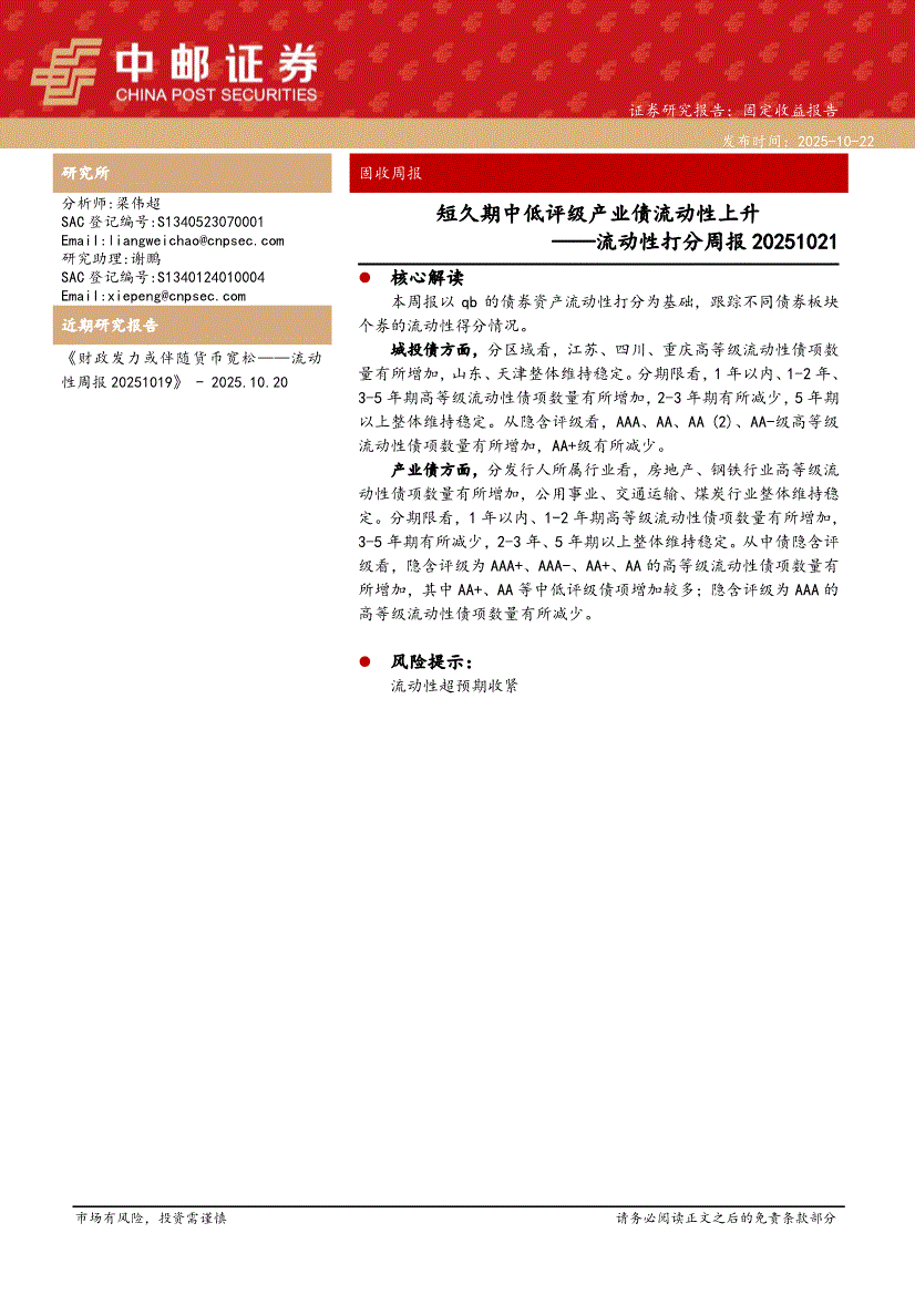 中邮证券-流动性打分周报:短久期中低评级产业债流动性上升-251022
