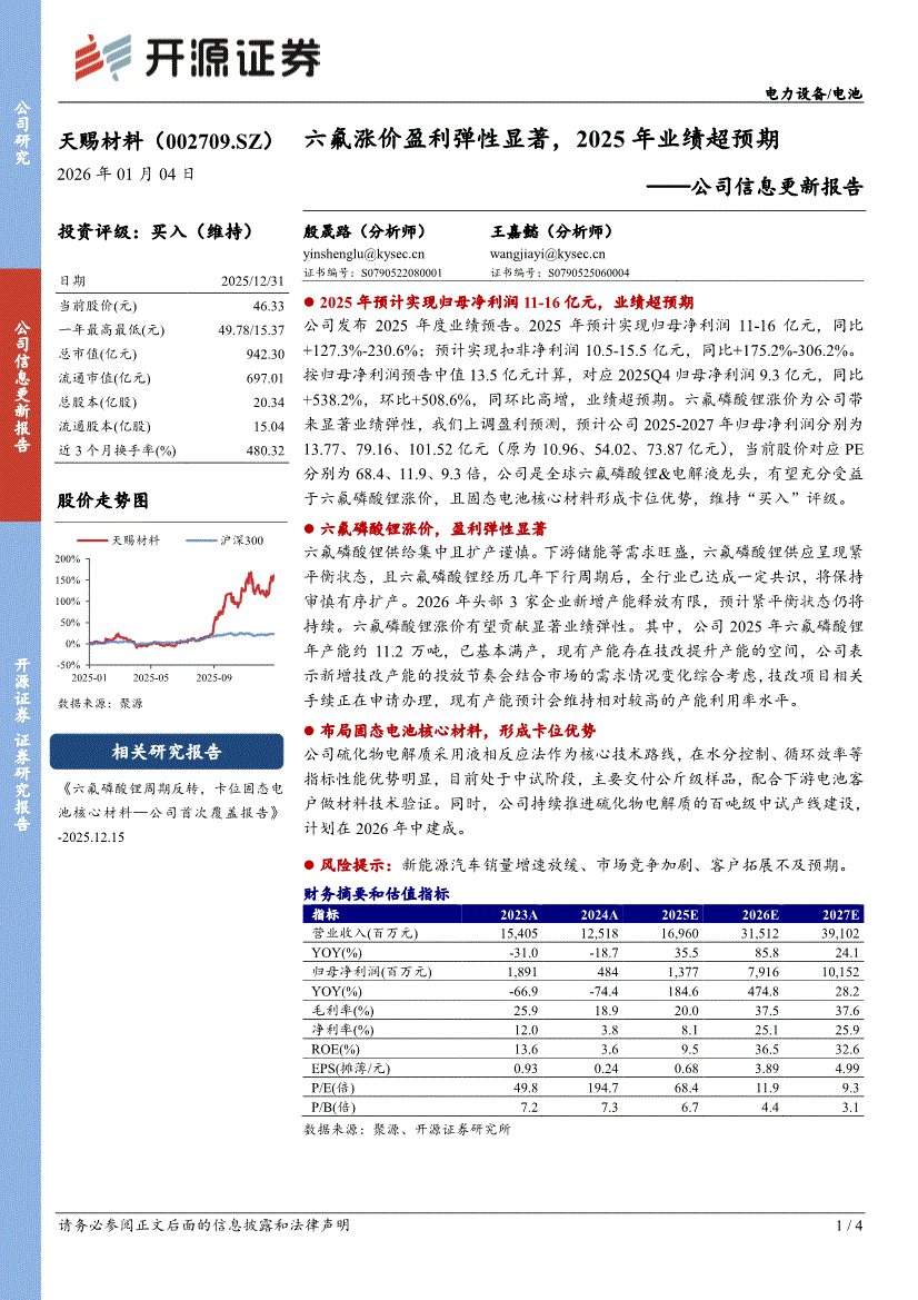 天赐材料:开源证券-天赐材料-002709-公司信息更新报告:六氟涨价盈利弹性显著,2025年业绩超预期-260104