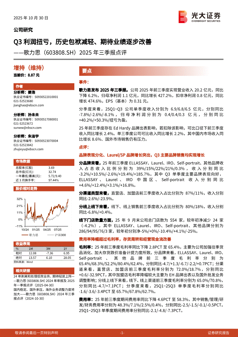 歌力思:光大证券-歌力思-603808-2025年三季报点评:Q3利润扭亏,历史包袱减轻、期待业绩逐步改善-251030