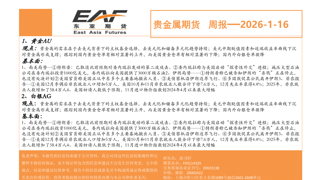 上海东亚期货-贵金属期货周报-260116