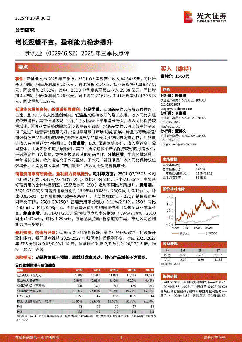 新乳业:光大证券-新乳业-002946-2025年三季报点评:增长逻辑不变,盈利能力稳步提升-251030
