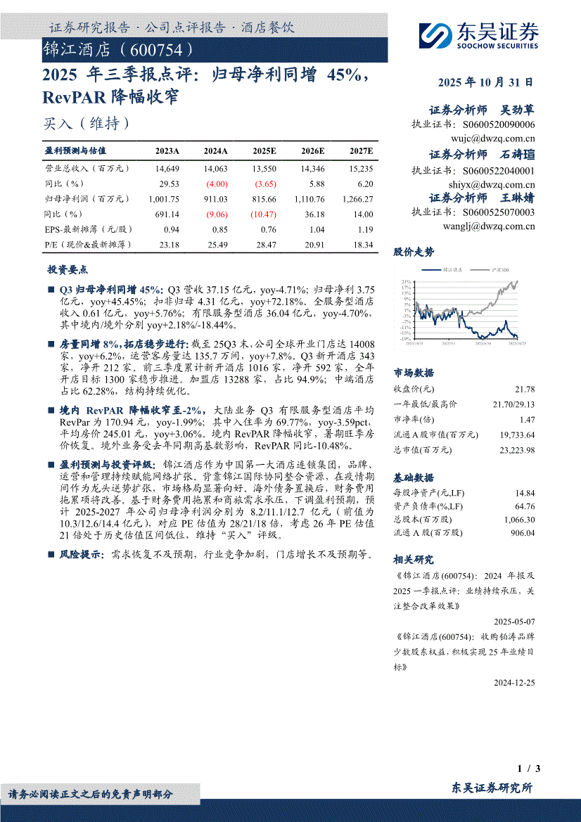 锦江酒店:东吴证券-锦江酒店-600754-2025年三季报点评:归母净利同增45%,RevPAR降幅收窄-251031
