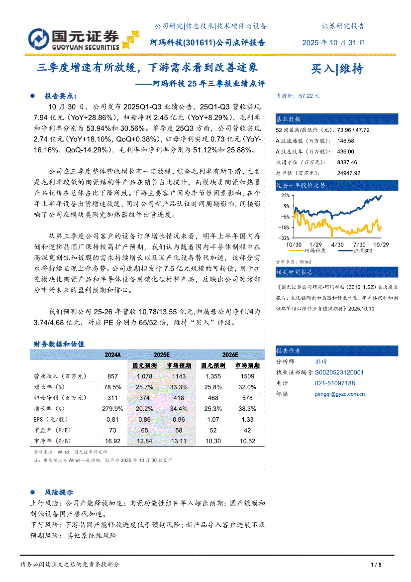 珂玛科技:国元证券-珂玛科技-301611-25年三季报业绩点评:三季度增速有所放缓,下游需求看到改善迹象-251031