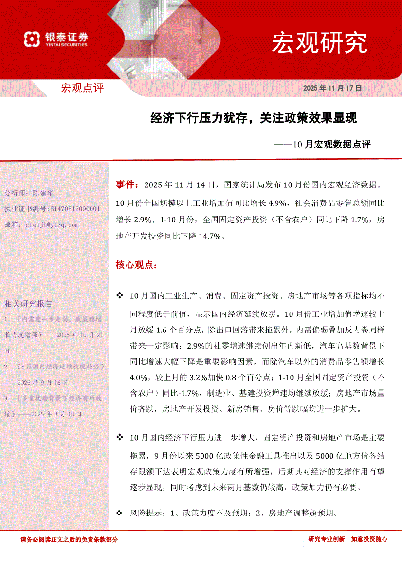 银泰证券-10月宏观数据点评:经济下行压力犹存,关注政策效果显现-251117
