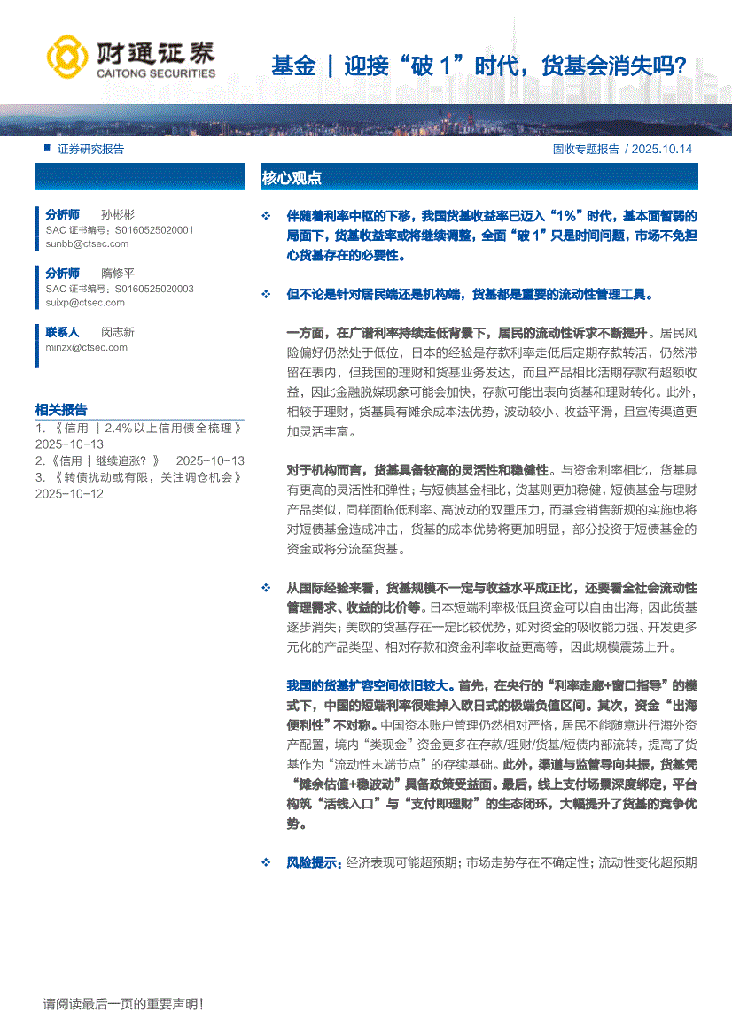 财通证券-基金|迎接“破1”时代,货基会消失吗?-251014