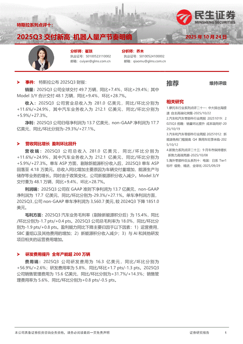 汽车行业:民生证券-汽车行业特斯拉系列点评十:2025Q3交付新高,机器人量产节奏明确-251024