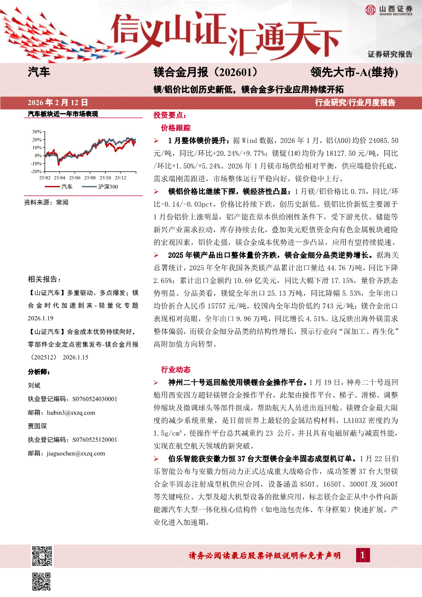 汽车行业:山西证券-汽车行业镁合金月报(202601):镁/铝价比创历史新低,镁合金多行业应用持续开拓-260212