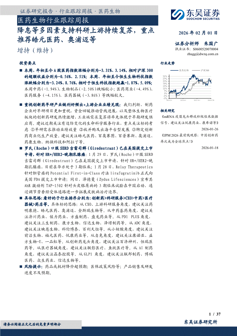 医药生物行业:东吴证券-医药生物行业跟踪周报:降息等多因素支持科研上游持续复苏,重点推荐皓元医药、奥浦迈等-260201