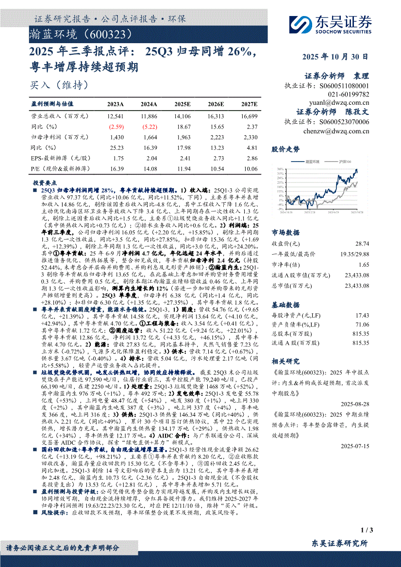 瀚蓝环境:东吴证券-瀚蓝环境-600323-2025年三季报点评: 25Q3归母同增26%,粤丰增厚持续超预期-251030