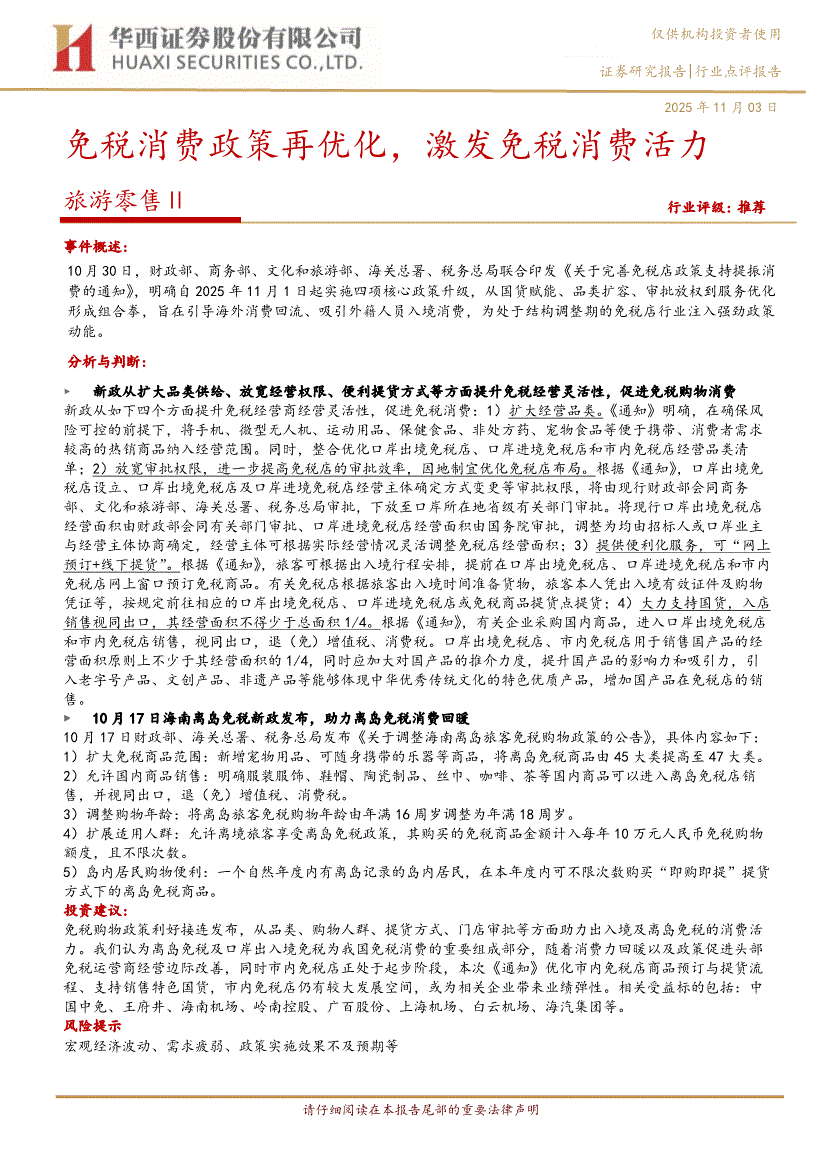 旅游零售Ⅱ行业:华西证券-旅游零售Ⅱ行业:免税消费政策再优化,激发免税消费活力-251103