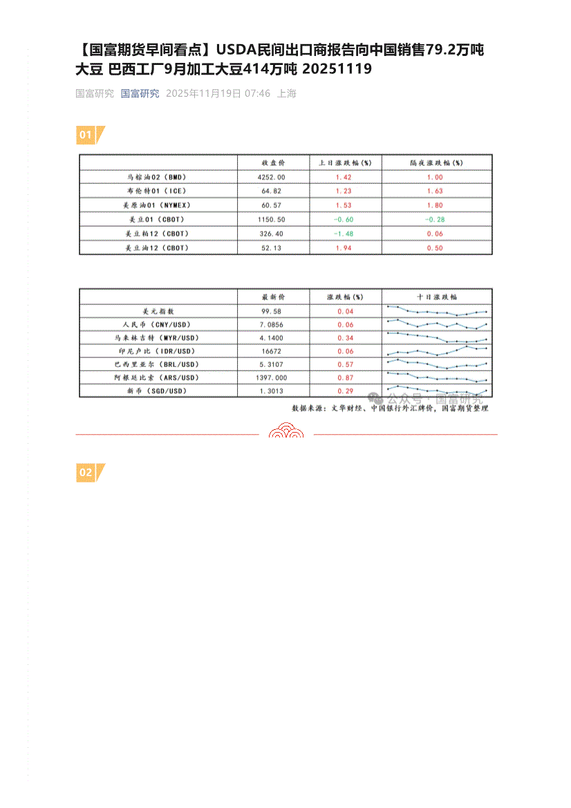 国富期货-【早间看点】USDA民间出口商报告向中国销售79.2万吨大豆,巴西工厂9月加工大豆414万吨-251119