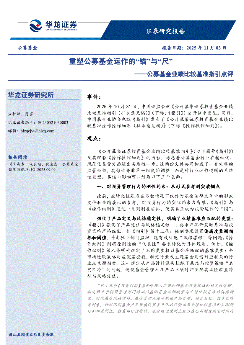 华龙证券-公募基金业绩比较基准指引点评:重塑公募基金运作的“锚”与“尺”-251103